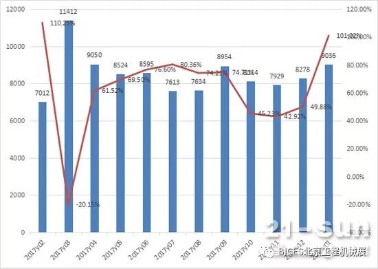 2017年4月份以来,装载机持续高位运行,单月销量始终稳定在7500台以上,同比增长率保持在40%以上。1月份,装载机再现101%的巨幅增长,这也为全年形势开了个好头,有理由相信,2018年装载机将带给我们更大的惊喜。
